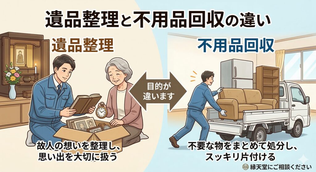 遺品整理と不用品回収の大きな違いは「目的」です。